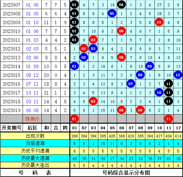 5。在历史同时中,后区号码和值分辩开出:17、12、13、7、6、9、14、13、5、11、11、21、15、14、10、17,出现界限在5-21之间,本期后区一码和值参考12。